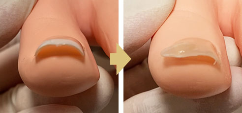 巻き爪専門に特化した補正技術になります。補正器具は、日本製の選び抜かれた特殊樹脂を使い、今までにない湾曲面をもった補正具を使用するため、巻いた爪を持ち上げることが可能となりました。もちろんゆっくり優しく持ち上げる為、優しい施術を受けて頂けます。